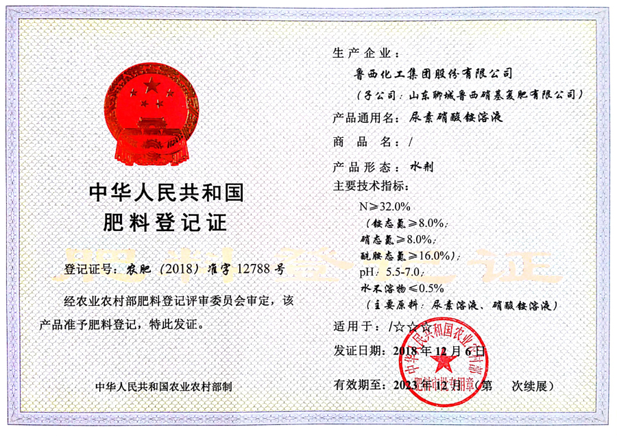 魯西集團(tuán)尿素硝酸銨溶液(32%)獲得農(nóng)業(yè)農(nóng)村部肥料登記證